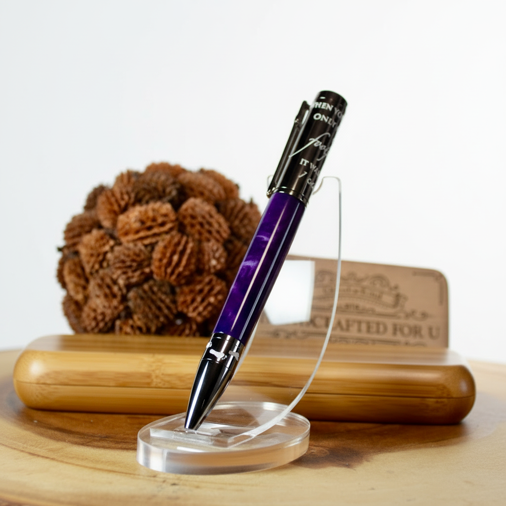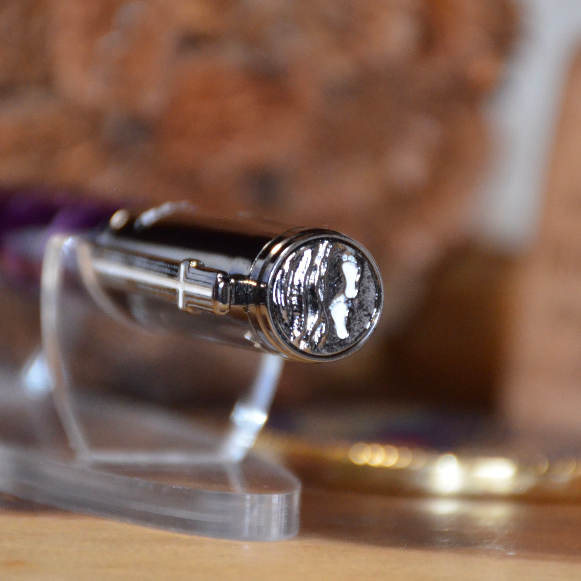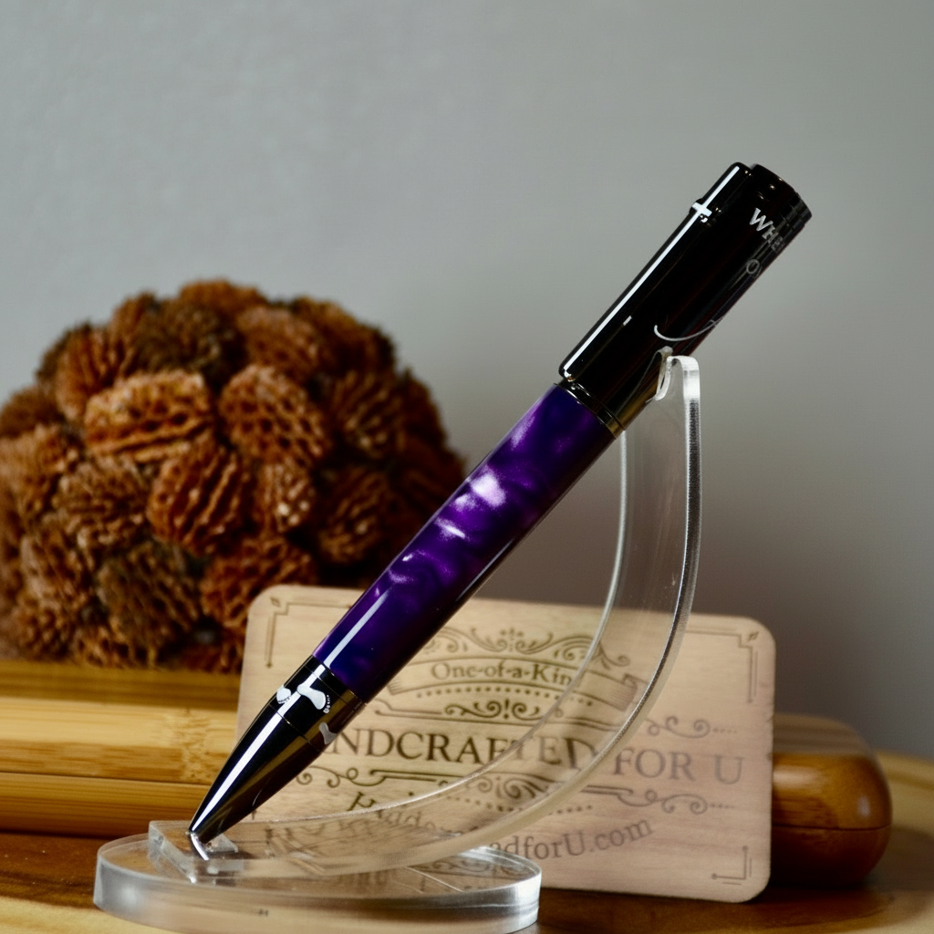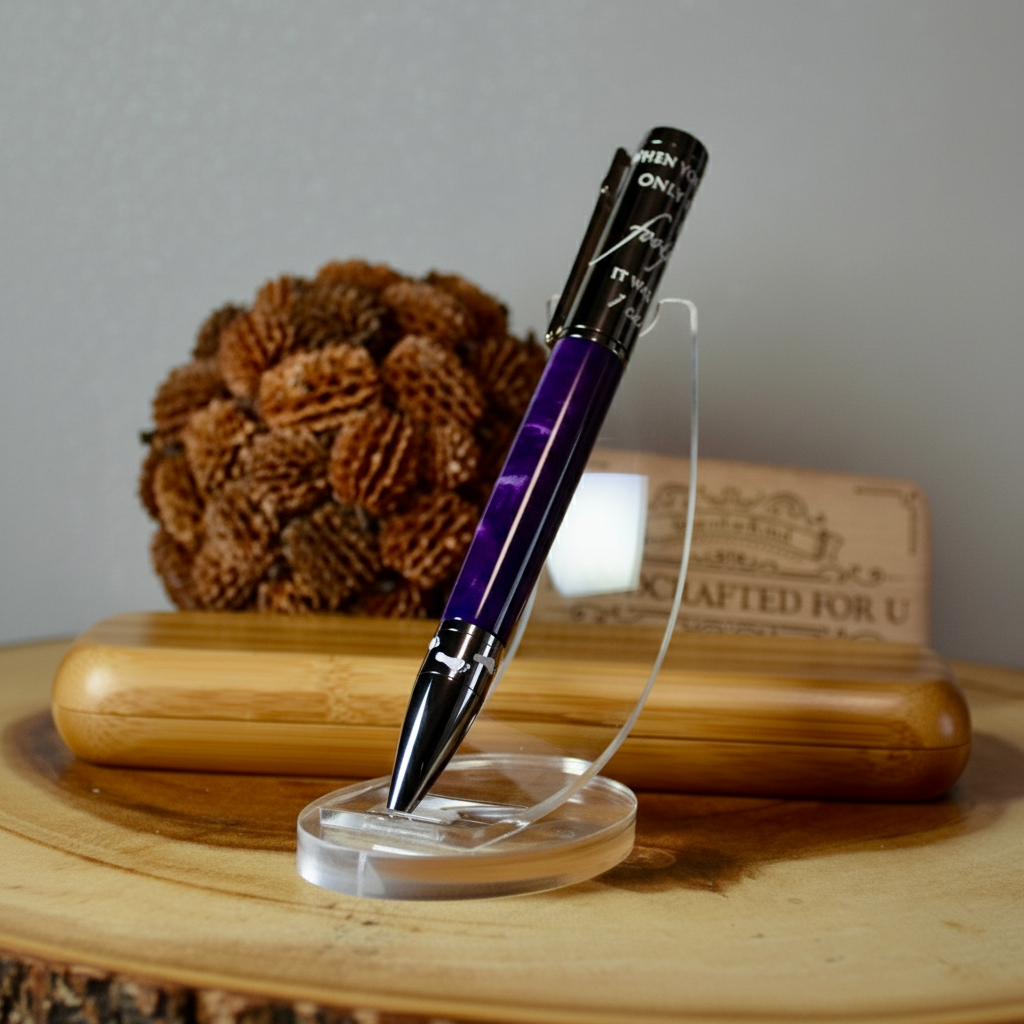 Looking for a thoughtful and unique gift? Look no further than Foot Prints in the Sand - a beautiful combination of gun metal and Aqua Bright Purple and Silver acrylic. Give the gift of tranquility and reflection with this charming piece. Perfect for any occasion, show your loved ones how much you care with this special gift. Included is a replacement parker refill and a soft leather pouch for storage.