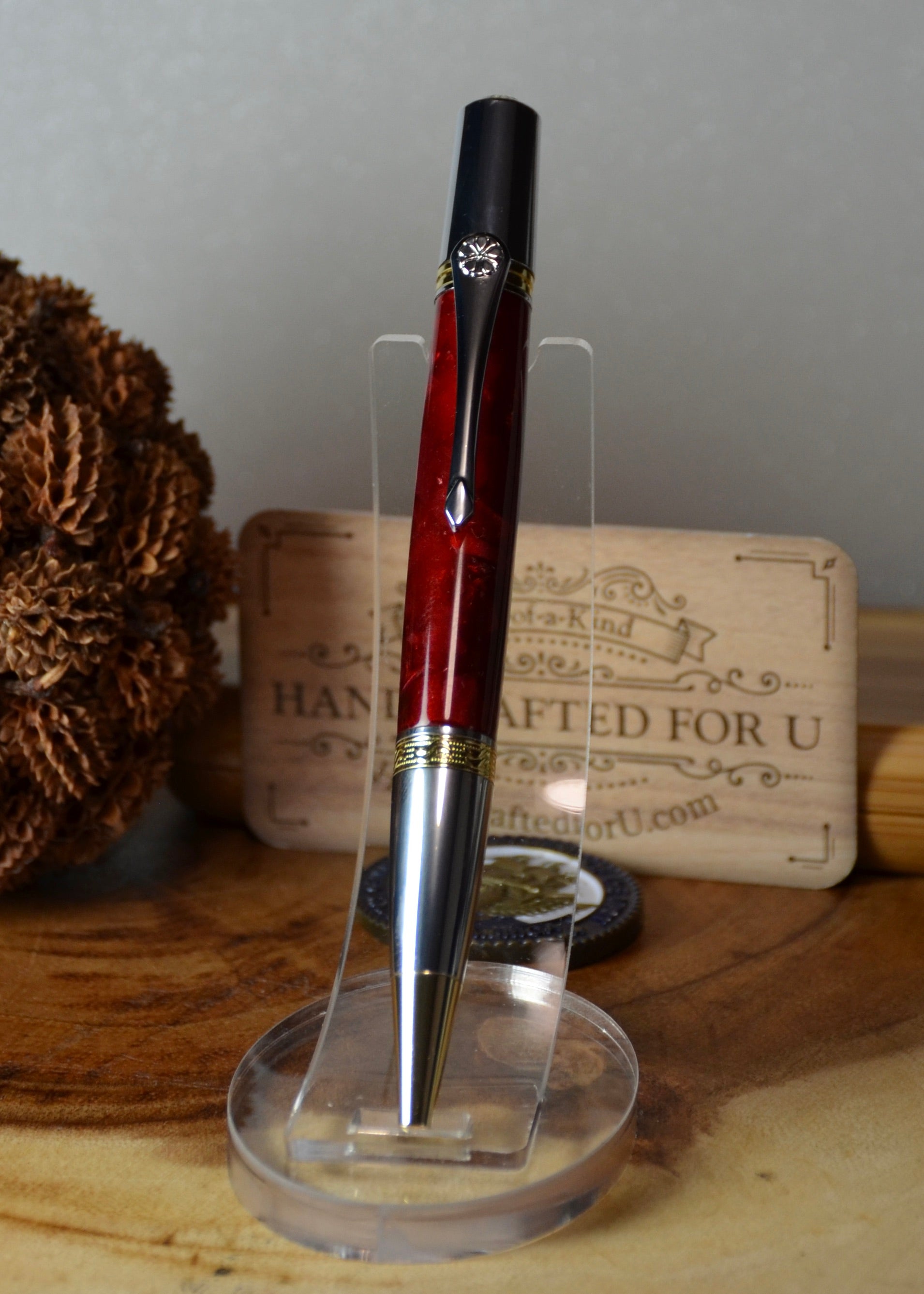 This meticulously handcrafted Gallant pen showcases a Black Cherry Ice acrylic finish, enhanced by gleaming Chrome and Gold hardware. Perfect for those who appreciate the intersection of aesthetic beauty and everyday utility, it delivers a writing experience worthy of your finest moments. This pen comes with a Parker refill and a leather pouch, ensuring both protection and portability.