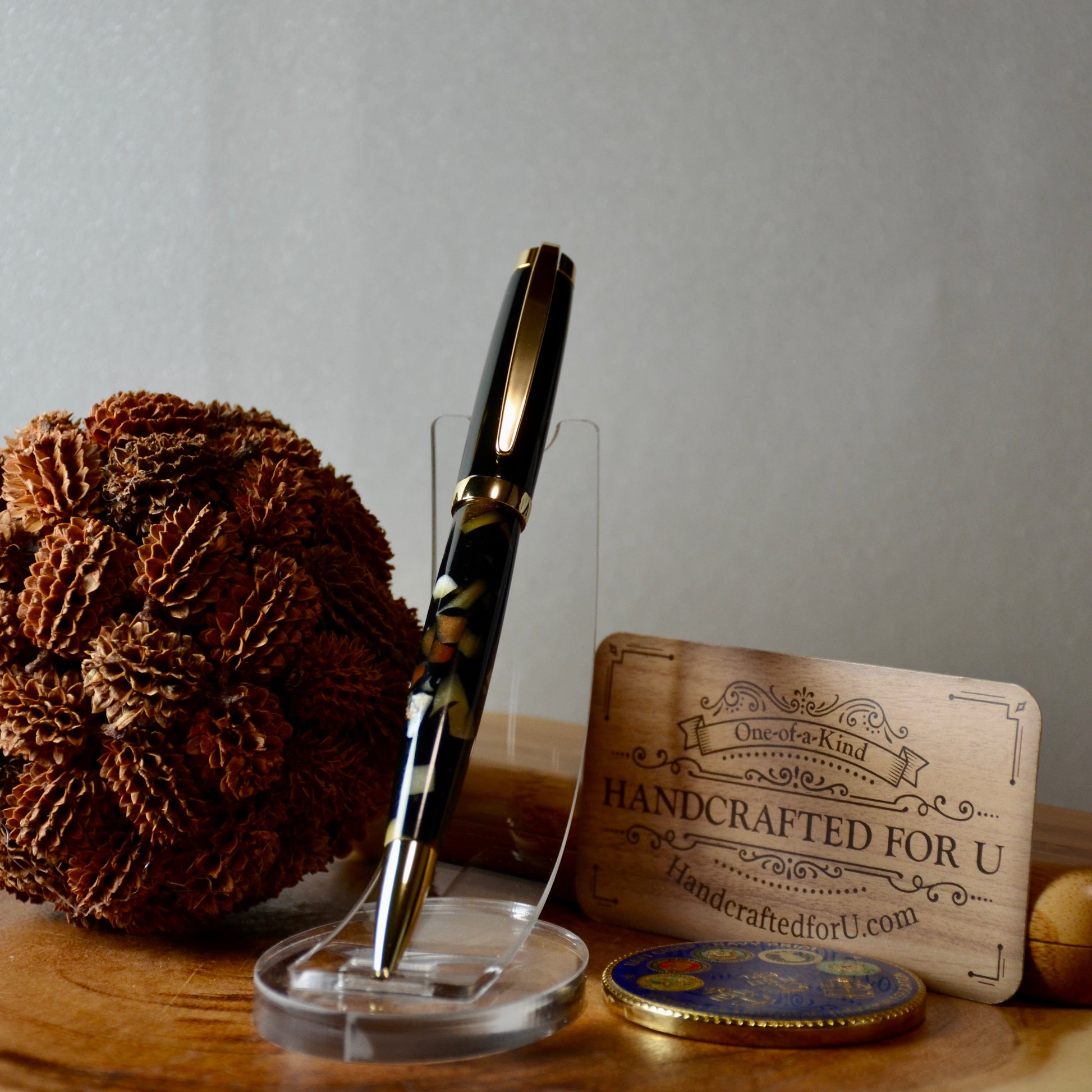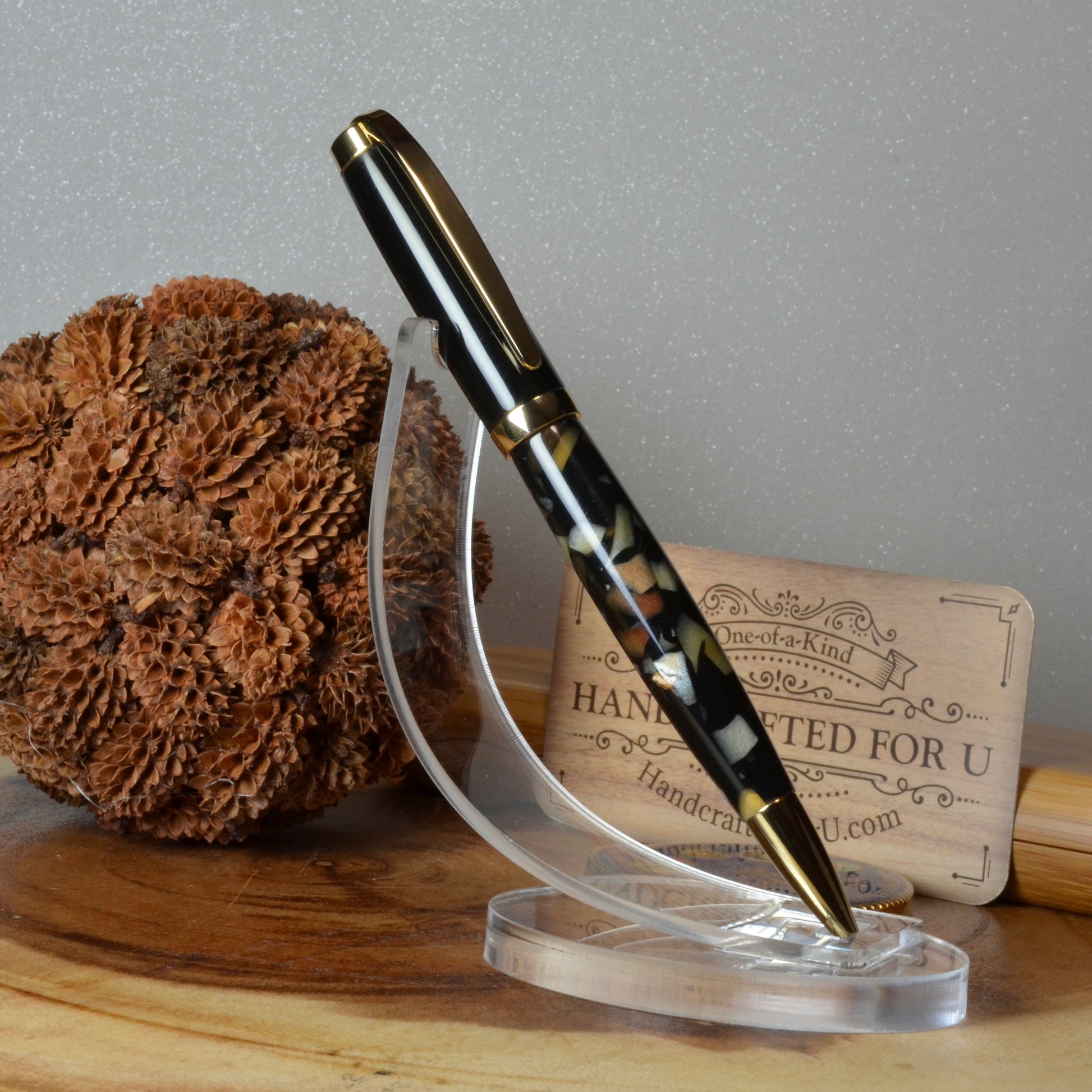 Crafted from Black and Gold Treasure acrylic, this Graduate Twist Pen exemplifies refined taste with its seamless twist mechanism and premium Cross-style refill. A distinguished choice for commemorating or treasuring as a personal heirloom, it arrives complete with a supple leather pouch for safekeeping and an additional refill cartridge to extend its writing life.