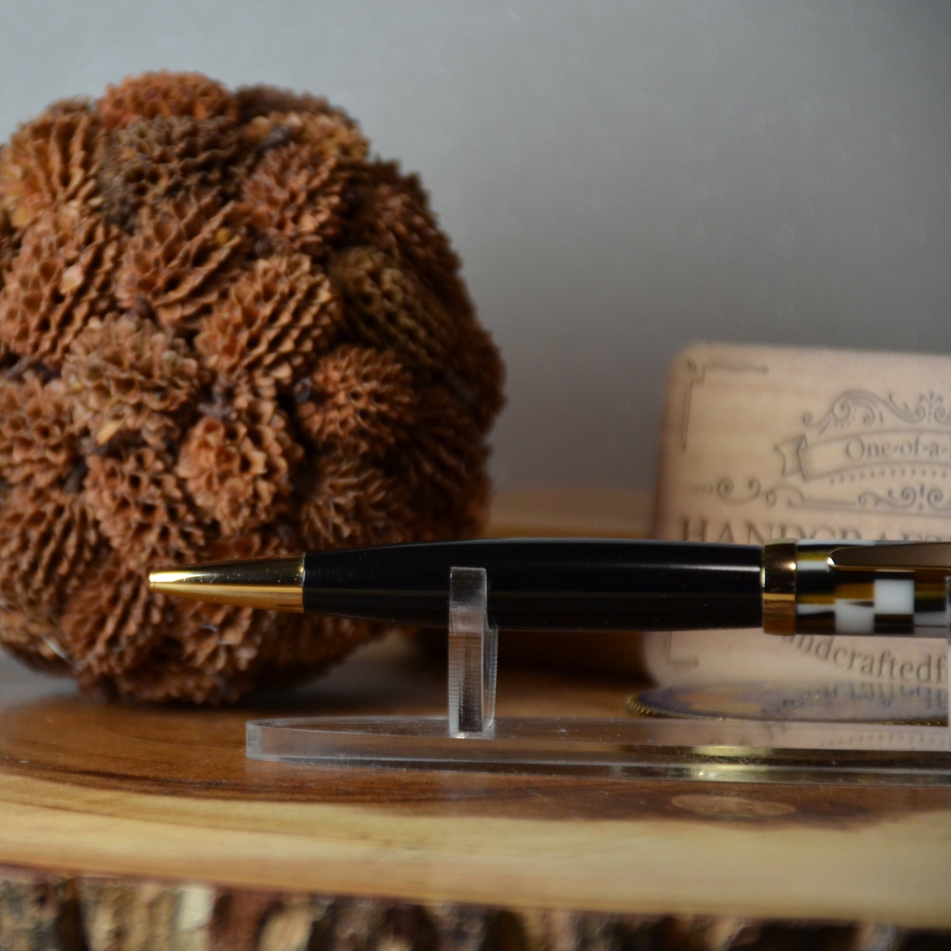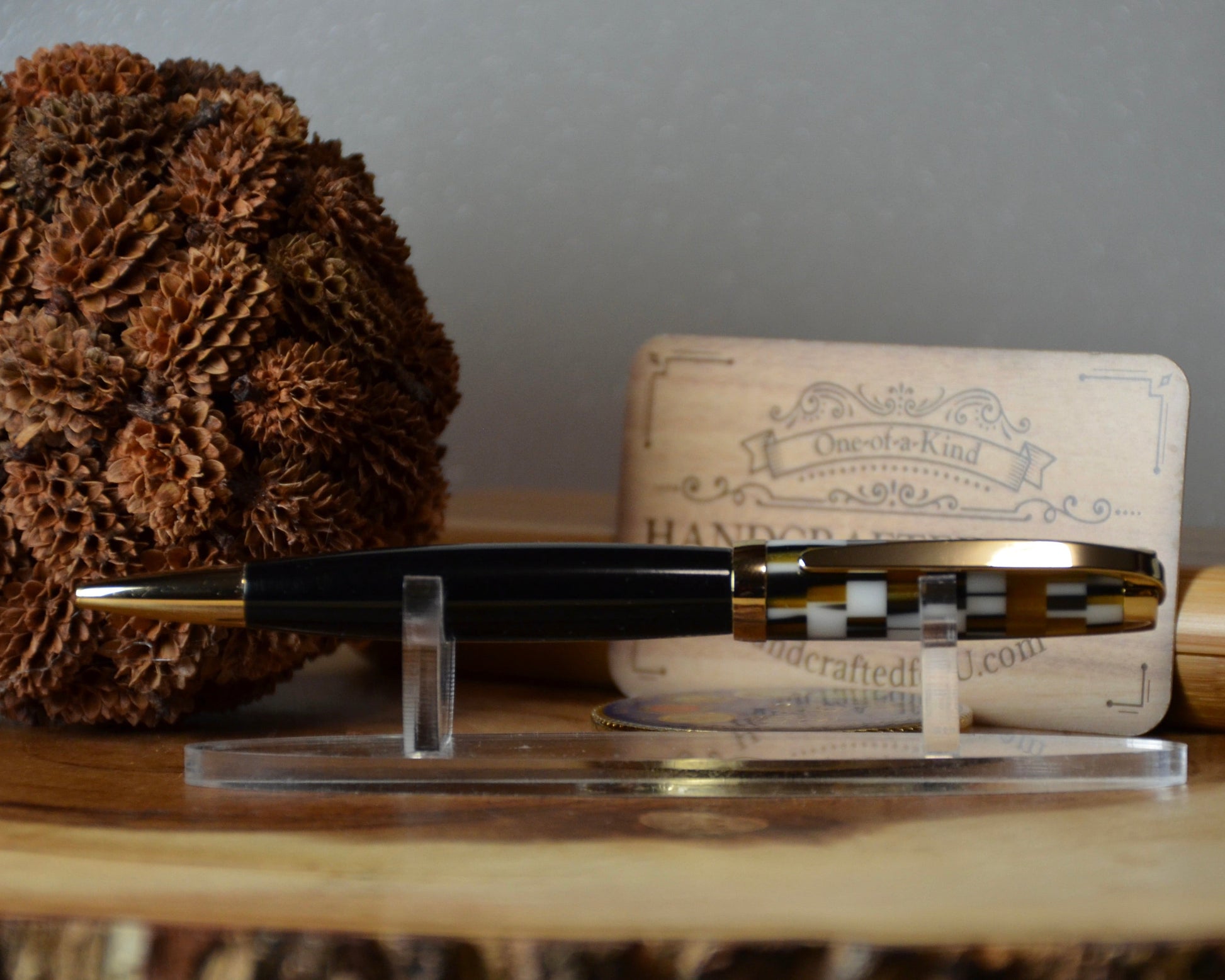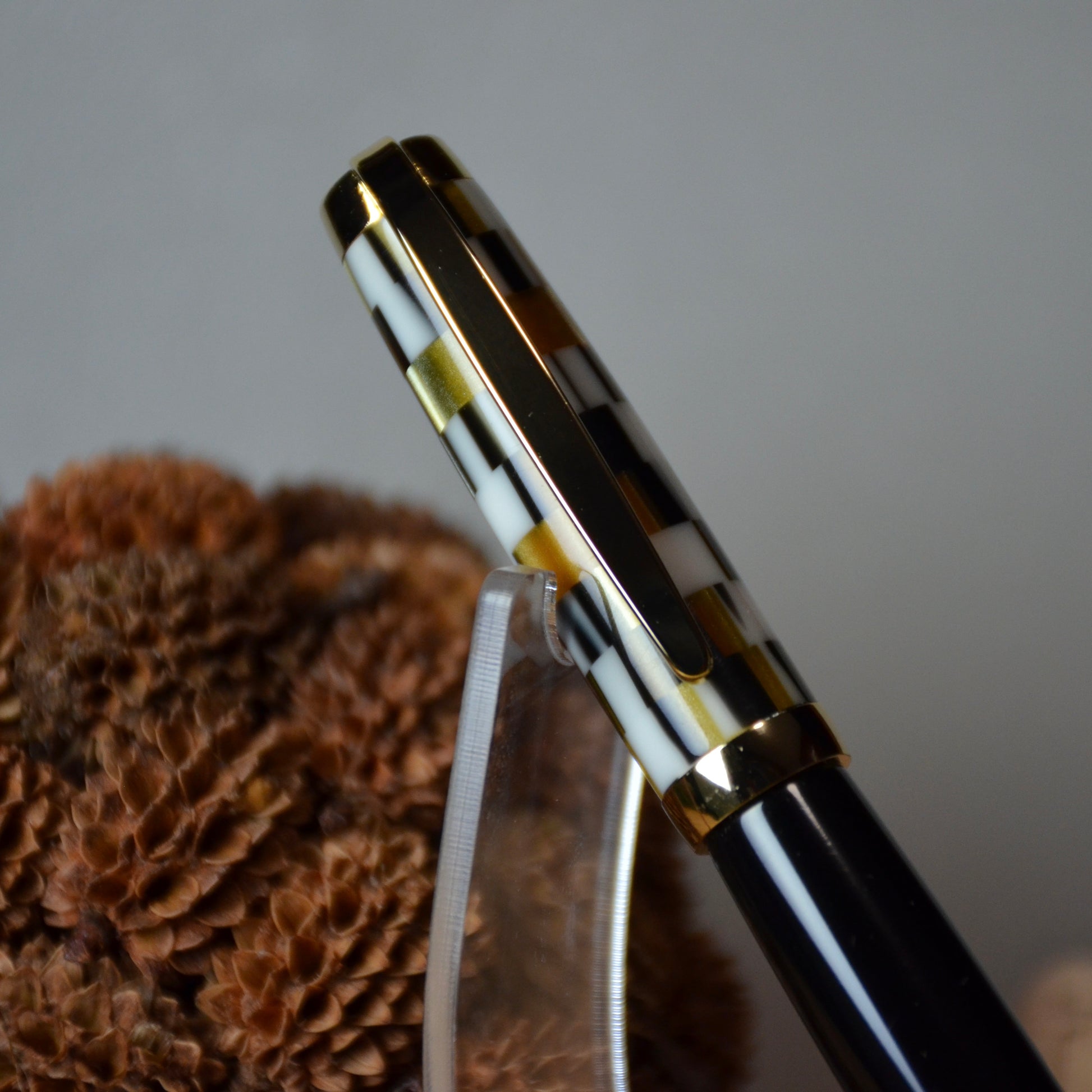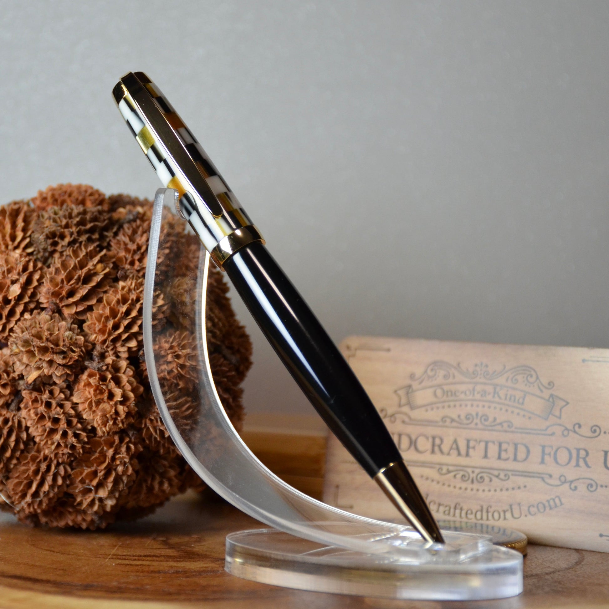 This handcrafted pen features a striking Black, White and Gold Mosaic acrylic and Gold accent, paired with a smooth twist mechanism and premium Cross-style refill. Ideal for marking significant milestones or establishing a timeless personal keepsake, the pen arrives with a protective leather pouch and spare refill cartridge, ensuring both longevity and everyday practicality for the discerning writer.