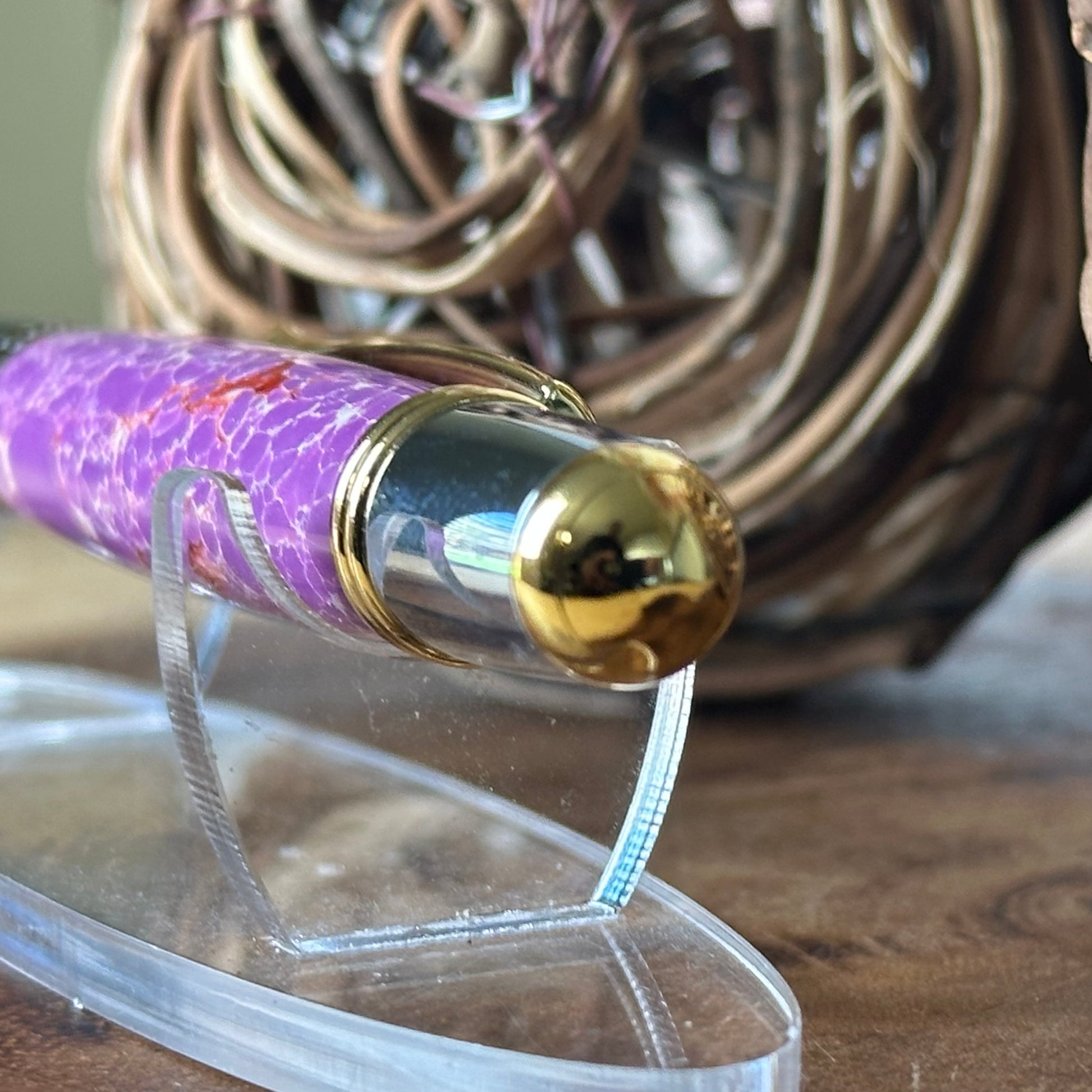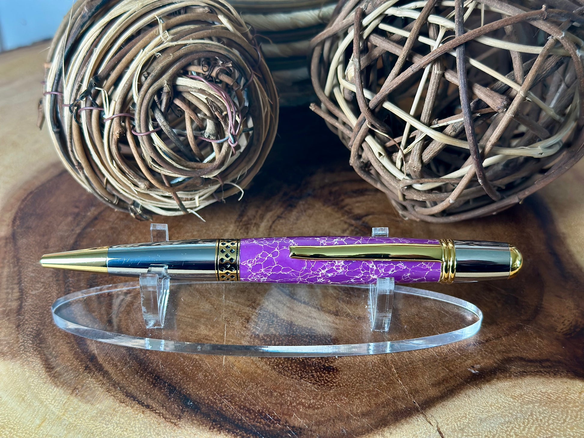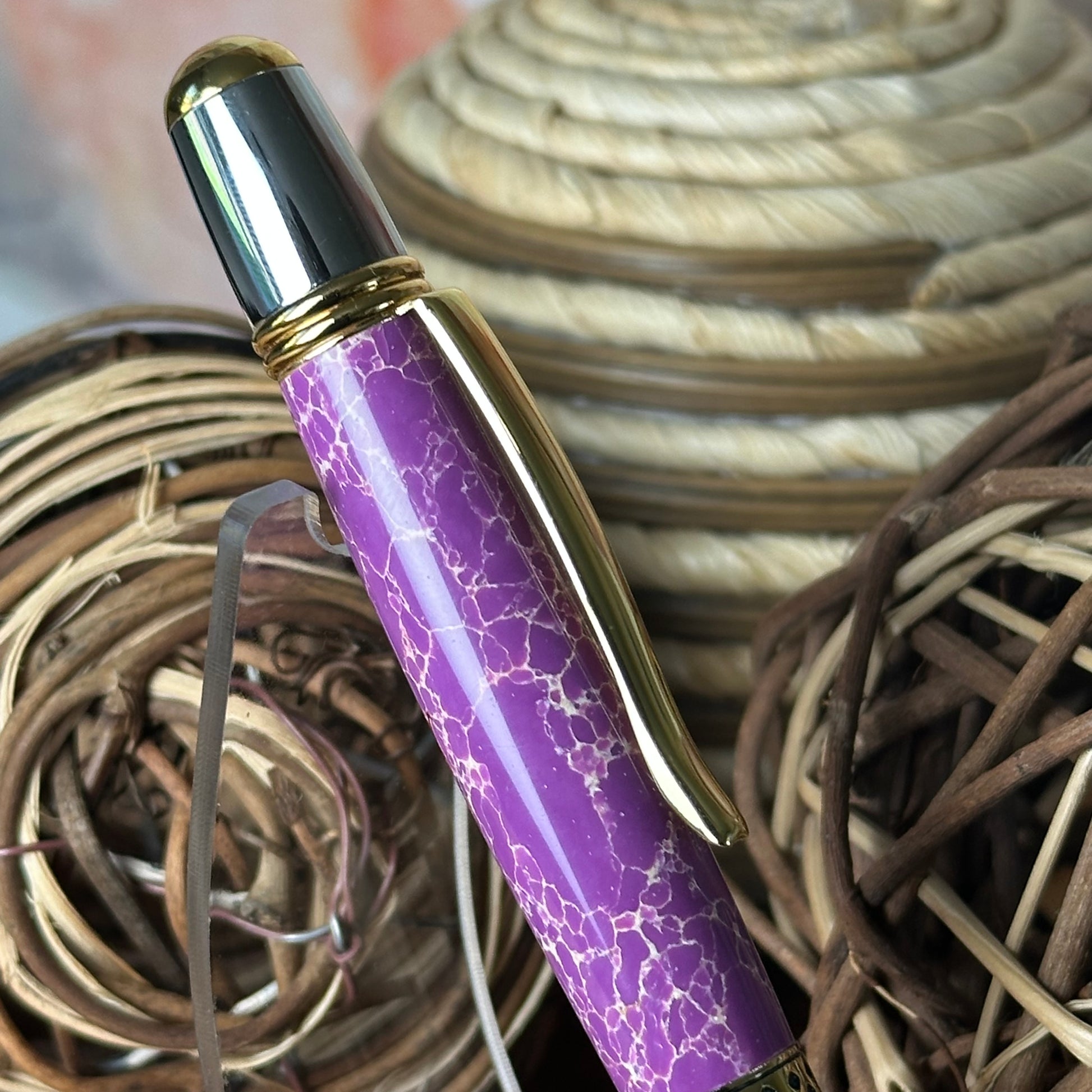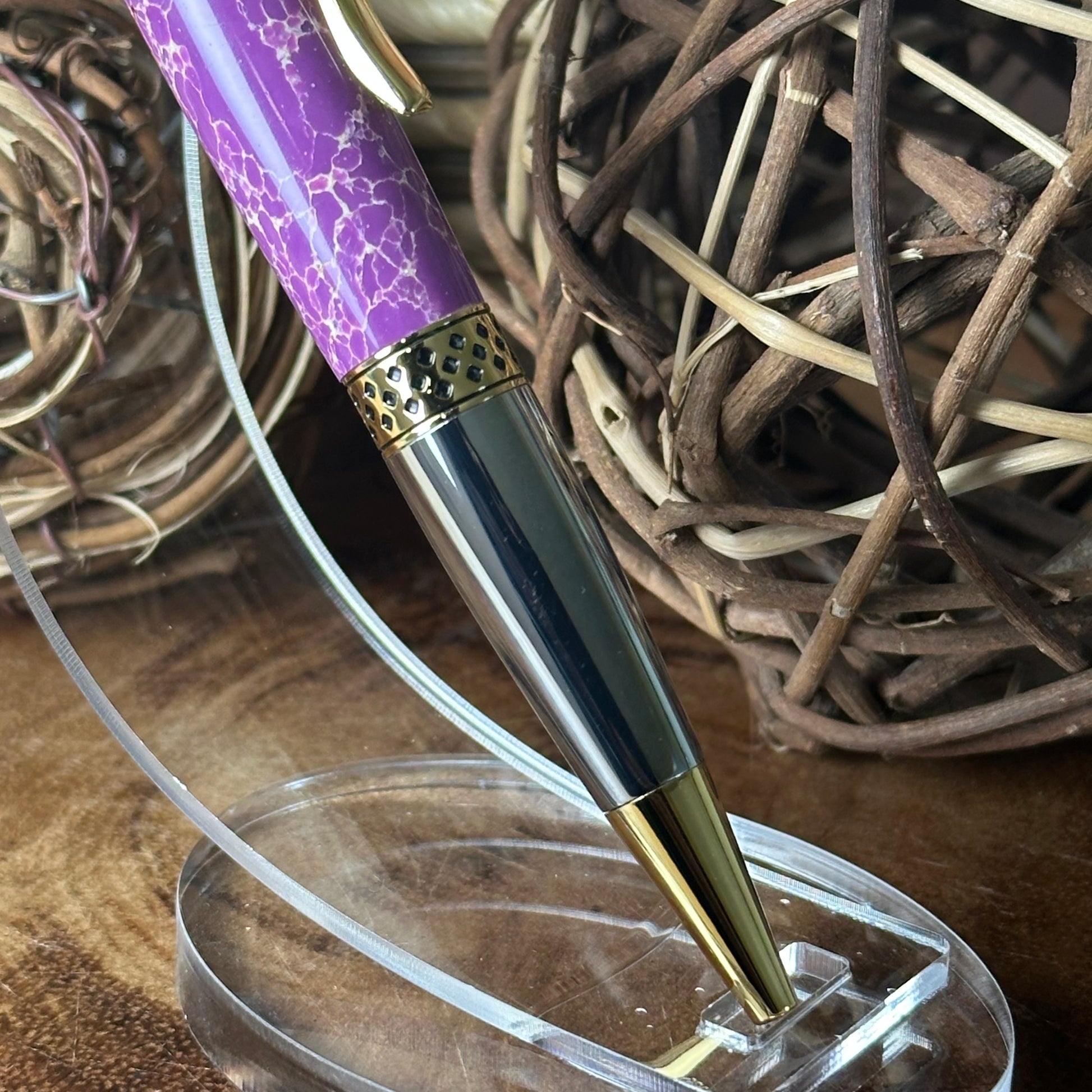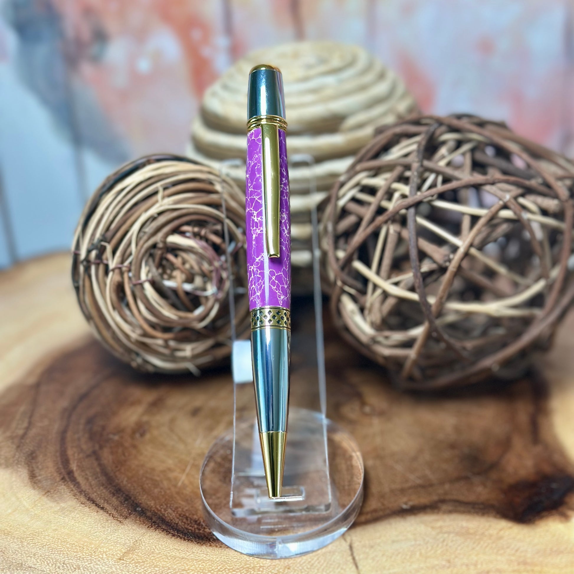 This Mesa Pen is expertly handcrafted, featuring a stylish combination of chrome and gold accents. Its distinctive Faux Stone Acrylic is a stunning mix of vibrant violet-purple, copper, and white, creating a truly unique appearance.