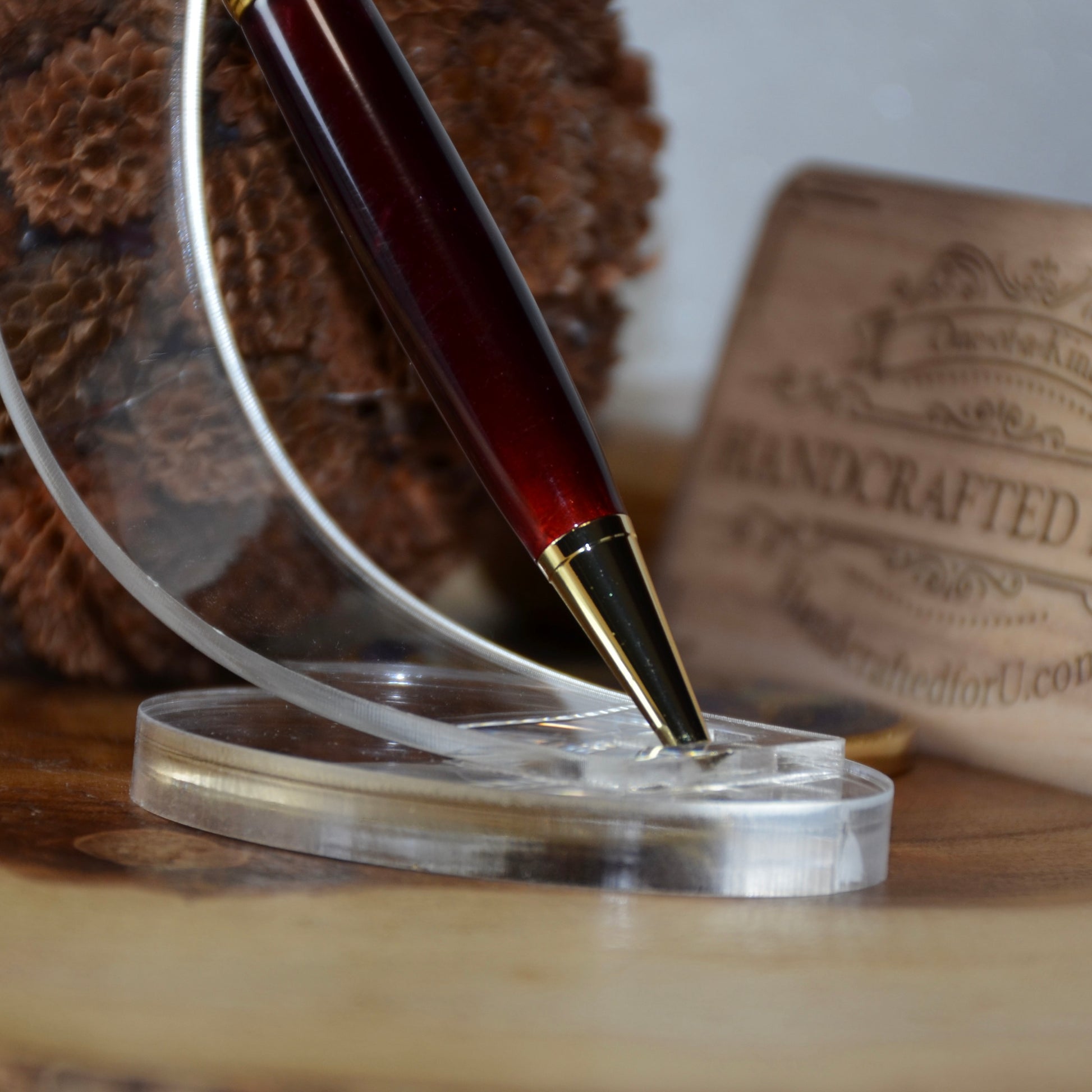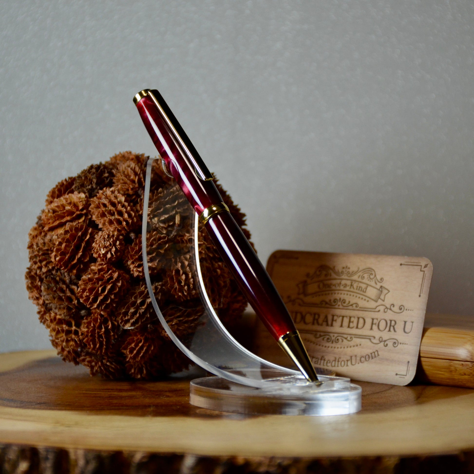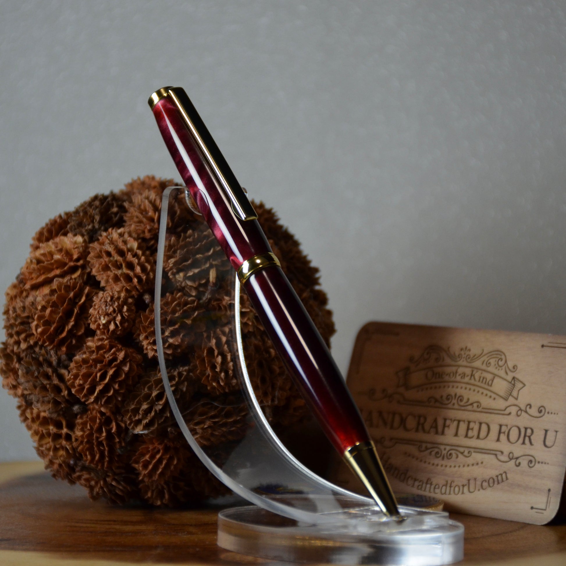 This slimline pen combines a captivating raspberry marble acrylic body, paired with sophisticated gold and black details, creates a writing instrument you'll genuinely enjoy using. We've included a compatible refill and a soft leather pouch in your preferred color. This thoughtful package ensures you have a pen that's as practical as it is beautiful, ready to support your daily endeavors with quiet confidence.